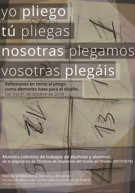 La exposición "Yo pliego, tu pliegas, nosotras plegamos, vosotras plegáis" es un espacio de experimentación y reflexión en torno al pliego como elemento básico para el diseño. Ésta es una muestra colectiva conformada por trabajos de alumnas y alumnos de la asignatura de Técnicas del Impresión del Grado en Diseño (curso 2017/2018). Todas las piezas tienen como objetivo la autoedición, utilizando como soporte el pliego con una imposición determinada de páginas (8,16 o 32), y manteniendo el formato íntegro, sin cortes que separen las páginas en cuadernillos. El resultado que se presenta busca plasmar con creatividad sus inquietudes como diseñadores, salvando las limitaciones impuestas por la necesidad de mantener el pliego completo.