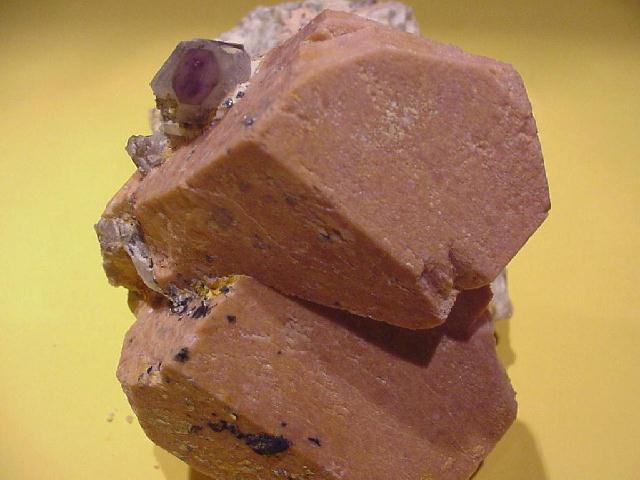 Reproducción de cristales de ortosa, con diferente desarrollo. Abajo a la derecha está reproducida una macla de Baveno.