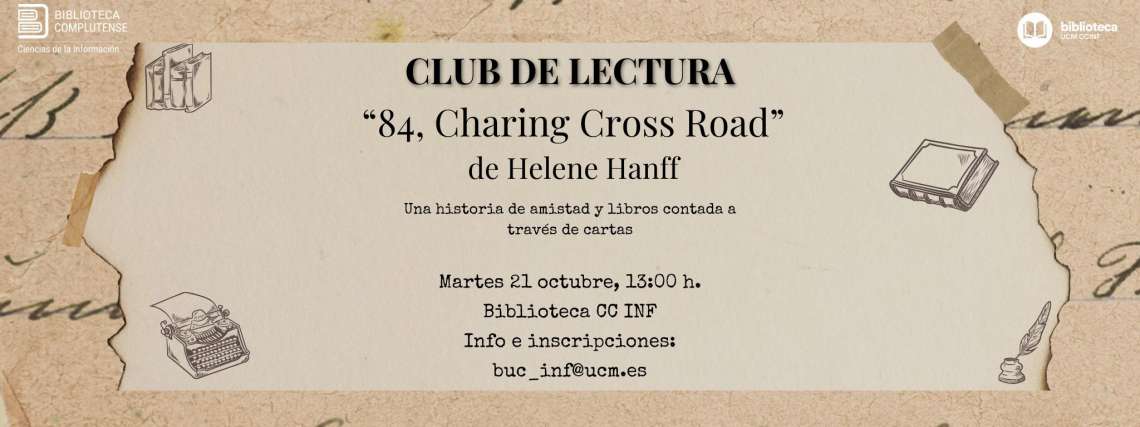 El Club de Lectura de la Biblioteca de Ciencias de la Información celebrará su próximo encuentro el martes 21 de octubre a las 13:00 horas. En esta ocasión, la obra elegida es 84, Charing Cross Road, de Helene Hanff, un clásico contemporáneo que recoge la correspondencia mantenida durante dos décadas entre la autora neoyorquina y un librero londinense.